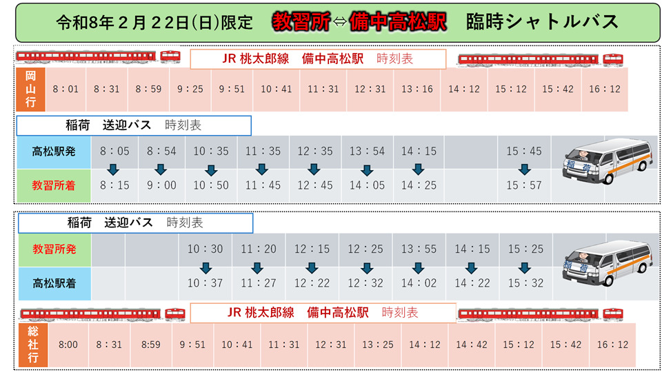 これに伴って、教習所⇔備中高松駅の臨時送迎バスを運行しますので、ぜひご利用ください。