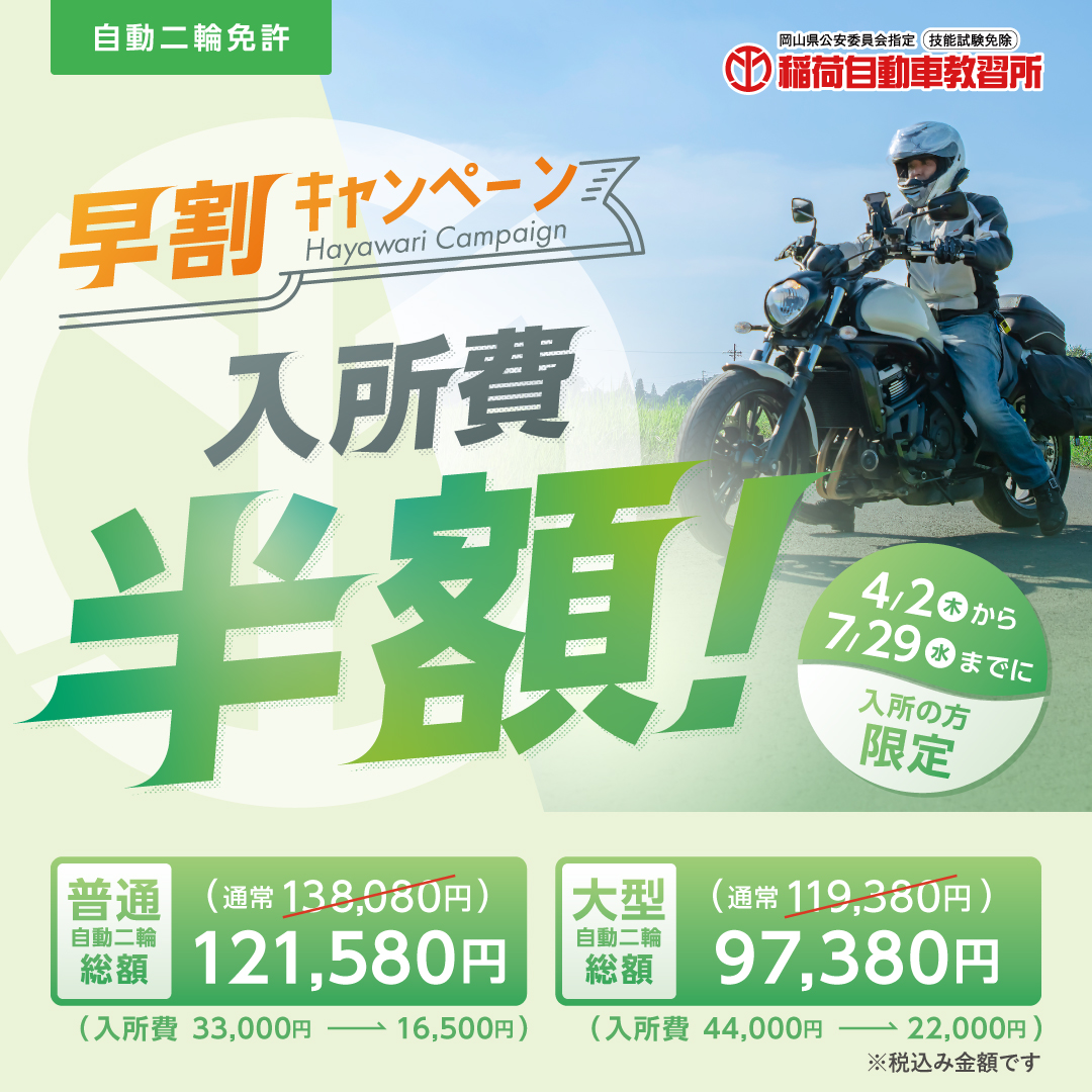 | キャンペーン内容 | 入所費半額! 普通自動二輪: 大型自動二輪: |